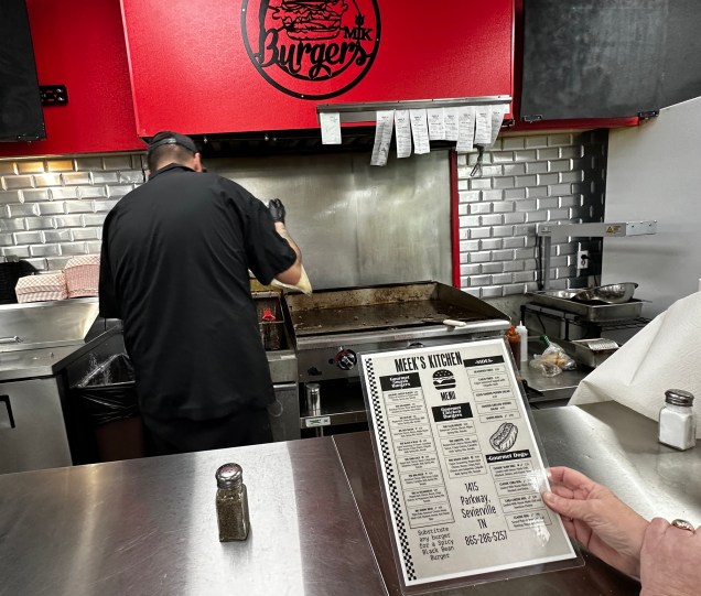 It took 5 months since they opened, but we finally made it to Meek’s Kitchen—and we weren’t disappointed. It is the best hamburger that I have had in Tennessee. Even more, it is tied for first place with my favorite burger ever: Poe’s Tavern on Sullivan’s Island, South Carolina. Things could not have been better because we got the best seats in the kitchen, across from the grill, and got to observe the kitchen in action.