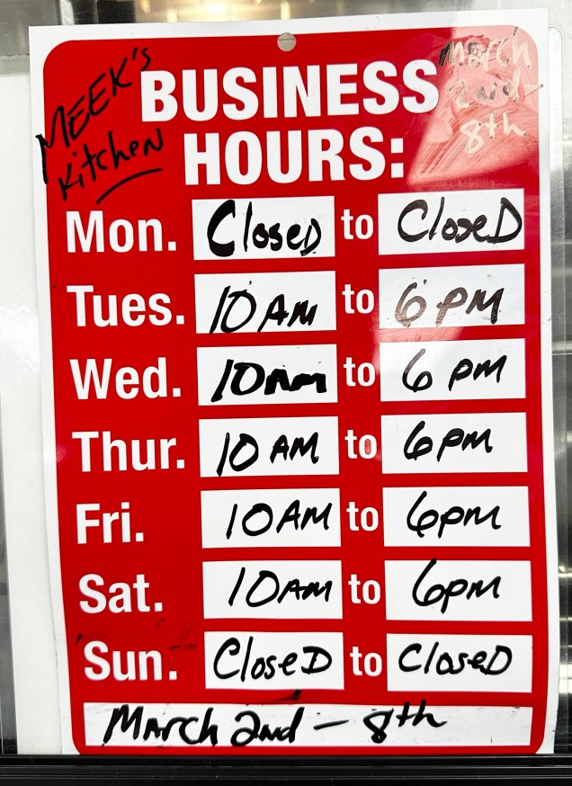 - Meek’s Kitchen is quite popular so this is a place that you may not be able to grab a quick lunch. Plan for it to take a while to order and get your food, then enjoy it.