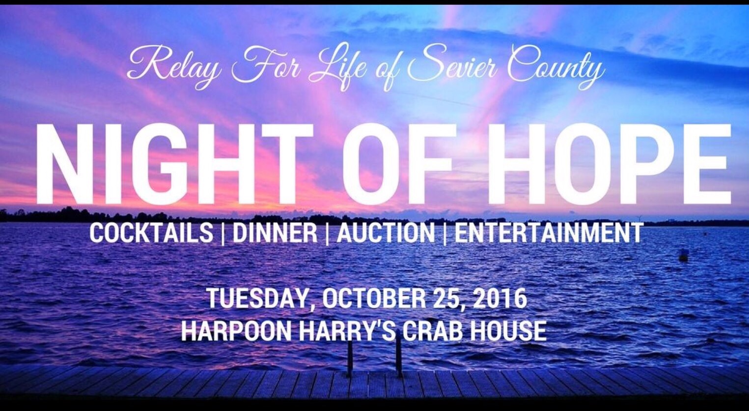 Relay for For Life of Sevier County and Harpoon Harry’s Crab House presented the second annual Night of Hope on Tuesday evening, October 25, 2016. This was my first Relay for Life event and it won’t be my last. Volunteers work hard in the fight against cancer so it is one of the most important causes that one could join. Here is what it was like.
