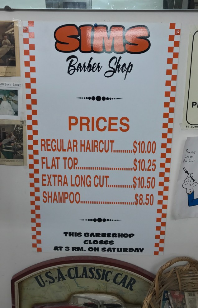 These prices have not changed in a long time. Mr. Sims said that in 1969, a haircut cost 75 cents and a flattop cut was $1.