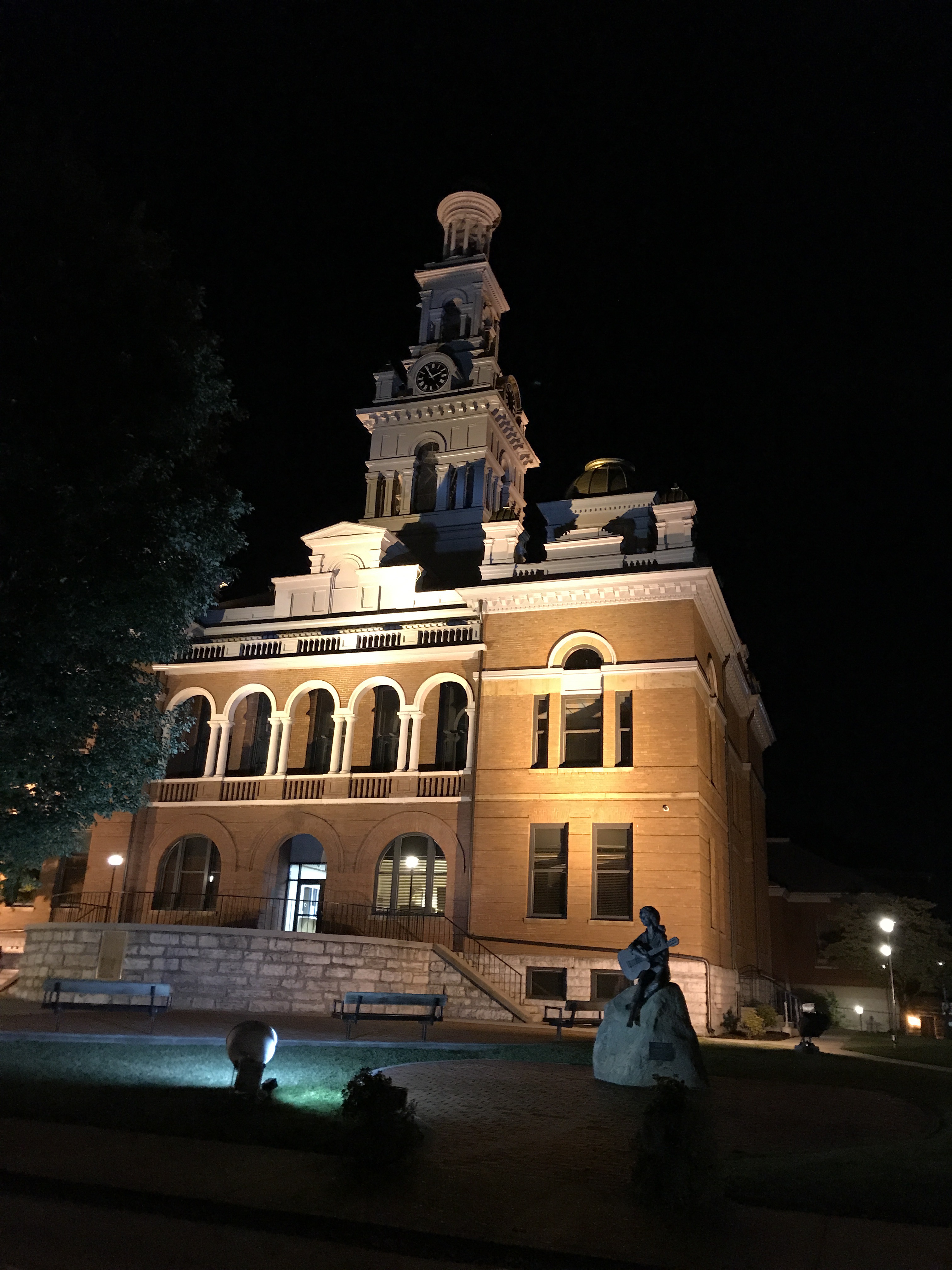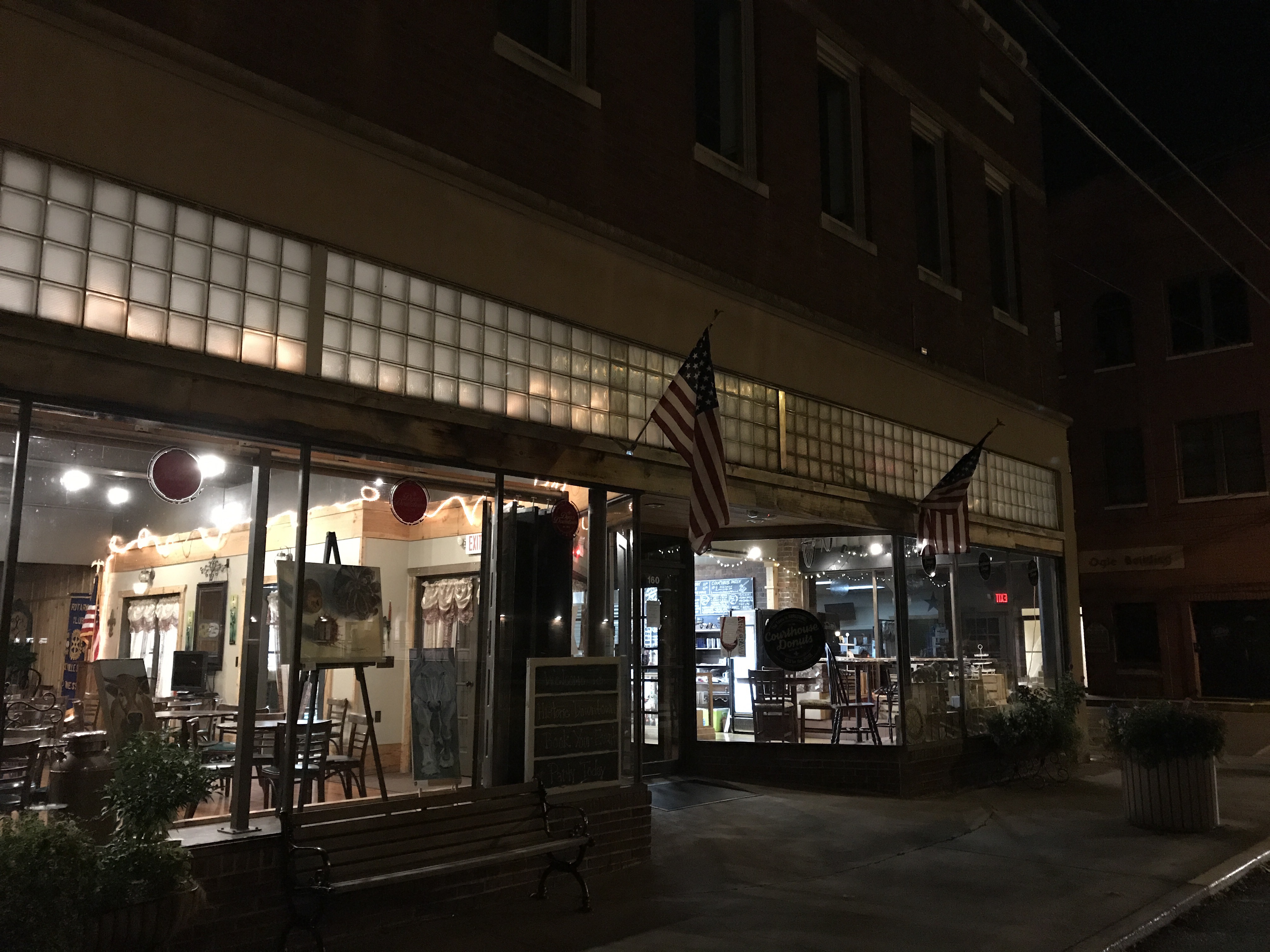Not stirring yet, but Courthouse Donuts is beautifully lit up from within.