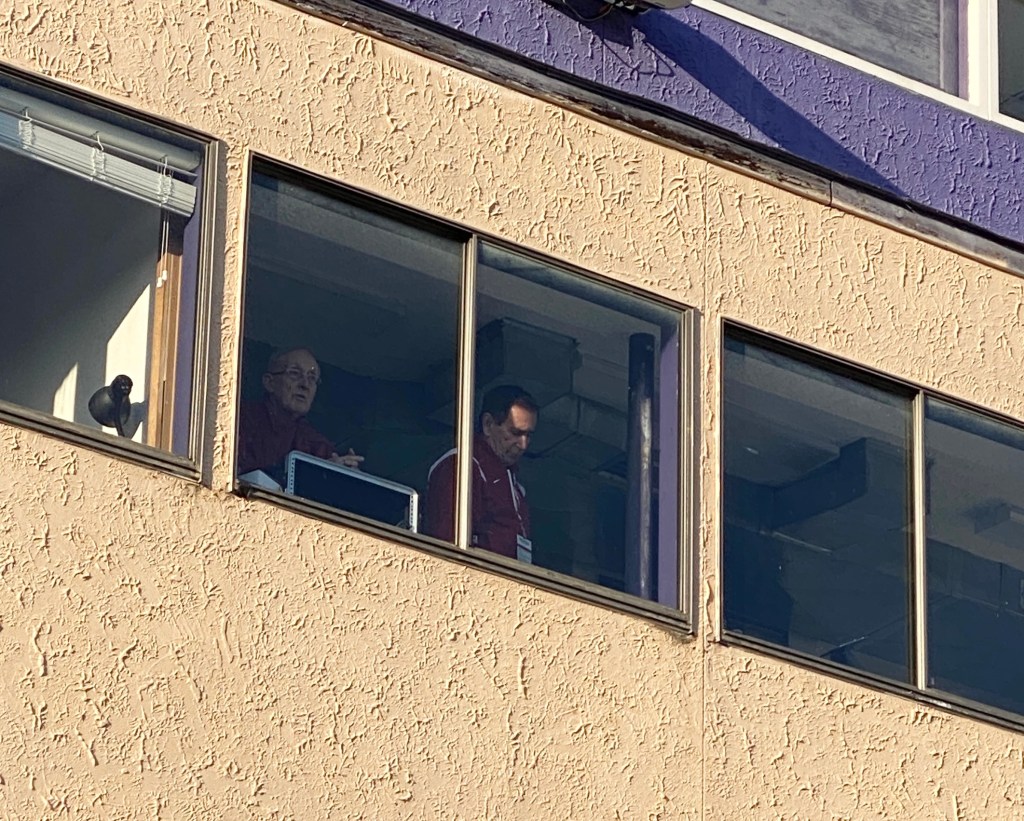 Conducting practice from the press box.