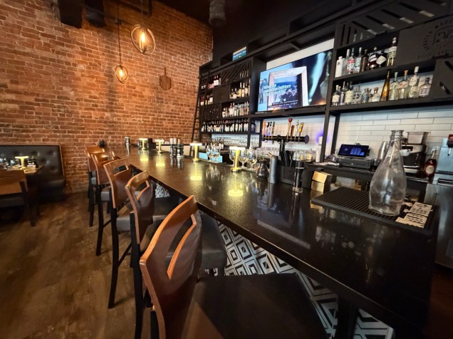 The bar is cozy and offers refreshment and entertainment on the large TV.