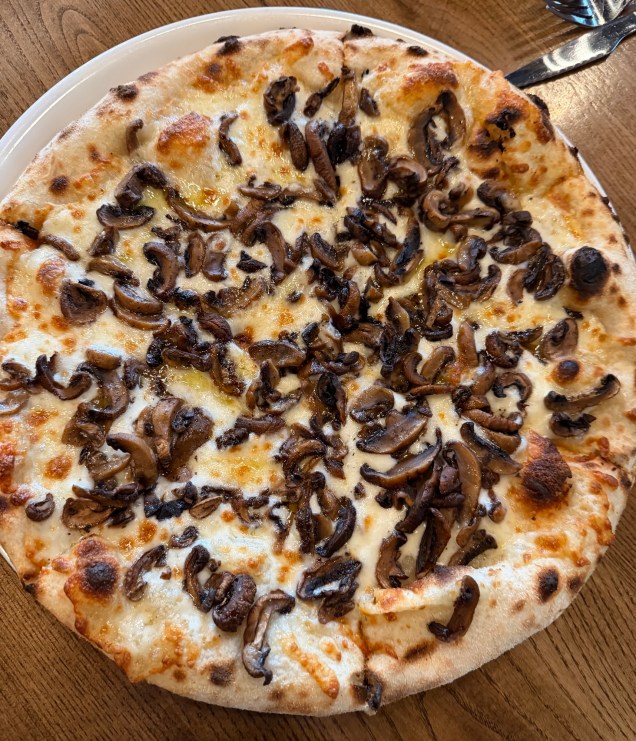 We decided to share a Neopolitan mushroom pizza. The waiter alerted us that it did not have a red pizza sauce, but we decided to try it—and it was excellent. Four ladies were able to have one generous slice + half of another. That is all we wanted with our soup or salad. There are many tempting items on the menu that are worth exploring in the future. In addition, the children’s menu looked good, including a child’s pizza.