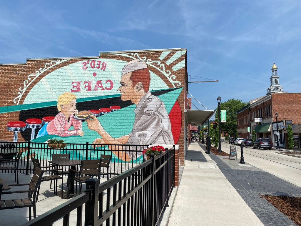 The Red’s Cafe mural in downtown Sevierville is facing the courtyard of the Appalachian Restaurant on Bruce Street. It is also located on the brick wall of Wanderlust Spa and Salon. This photo captures an interesting aspect of the mural, visible through the gazebo on Bruce Street.