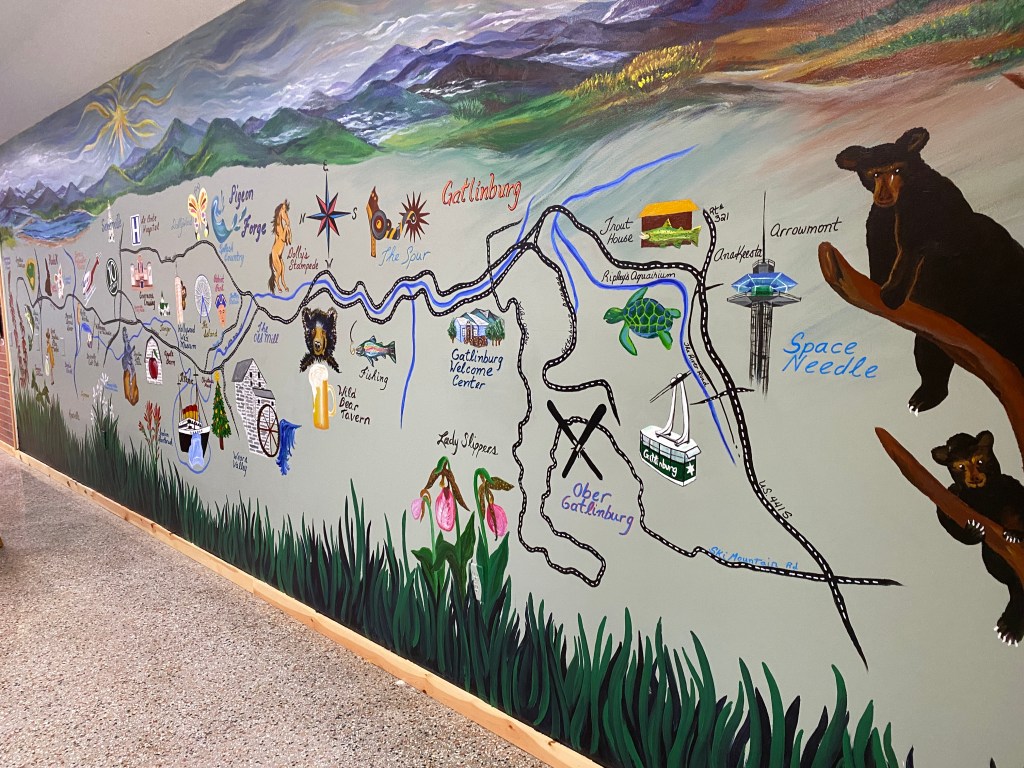 The finished project looks perfect on that section of the wall. The Sevierville Shuffle mural will visually carry you from Exit 407 to Gatlinburg and the Great Smoky Mountains. It is delightful!