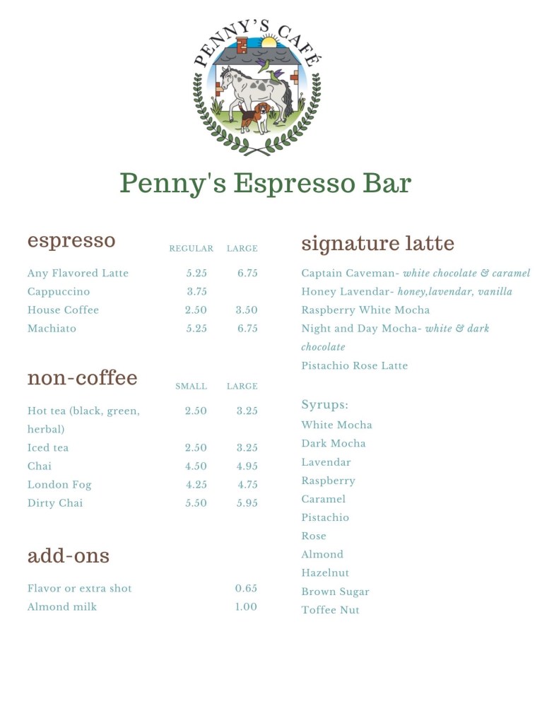 Here are some screen shots of the coffee menu from the Penny’s Cafe Facebook page. Go to the Facebook page to see more. Here is the link.