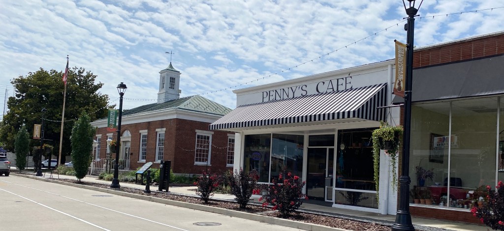 First, Penny’s Cafe is located across the street from the gazebo on Bruce Street—an excellent location. In the picture above, you can see the cafe is located to the right of the old post office building. Park in the parking lot across the street, on the street, or down the street near the courthouse and just walk a short distance for a really nice cappuccino.