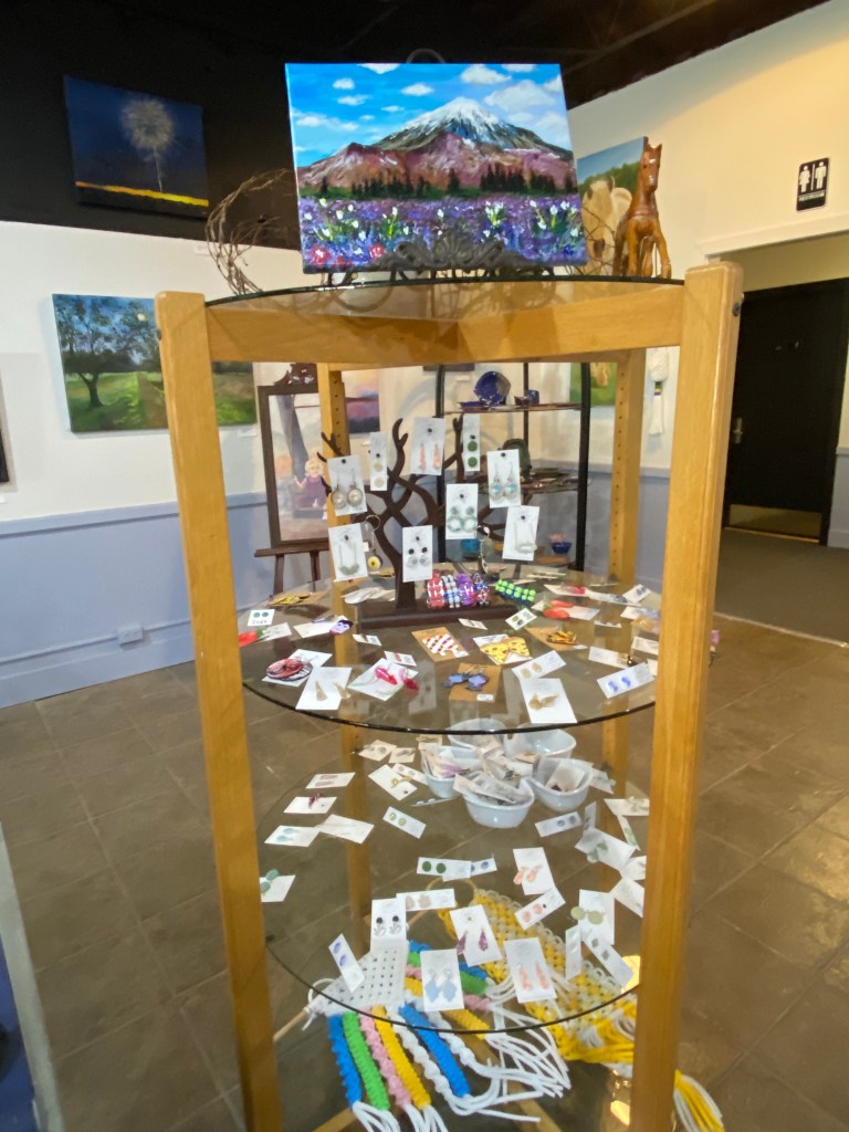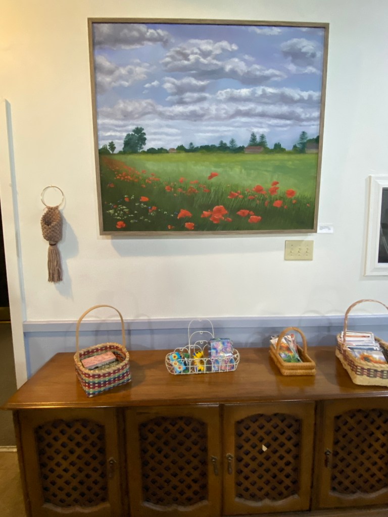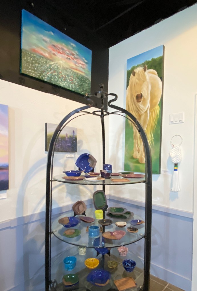 The new espresso machine makes one of the best cappuccinos that I have had this year in the U.S. I learned to love avocado toast on a trip to California so I was excited to see several variations on the menu. I ordered “Everything Avocado Toast” on rye bread, but you can order it on two other kinds of bread as well. It had the Everything Bagel seasoning and was quite substancial. I was not able to eat both pieces and was not hungry for hours. Penny’s Cafe is spacious and visually attractive, displaying work from local artists on the walls and in display cases. You will surely find a gift or personal treasure there. I found myself browsing the art and wondering what would look good on my walls.If you need a gift, one can be found in this display case…