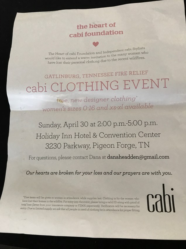 Last Sunday, the Cabi clothing company distributed almost 1,600 pieces of clothing to help women who had lost everything in the Gatlinburg wildfires last year. The company designs and sells women’s clothing so their foundation strives to assist and empower women. As a Cabi collector/fanatic myself, I knew this, but was still impressed that they would come to our area to help. Taking a chance tthat they would let me cover the story for this blog, I went to the Holiday Inn in Pigeon Forge on Sunday morning to check it out. Not only did they allow me to cover the story, I was able to stay and lend a hand. What an amazing day! Here is what happened.