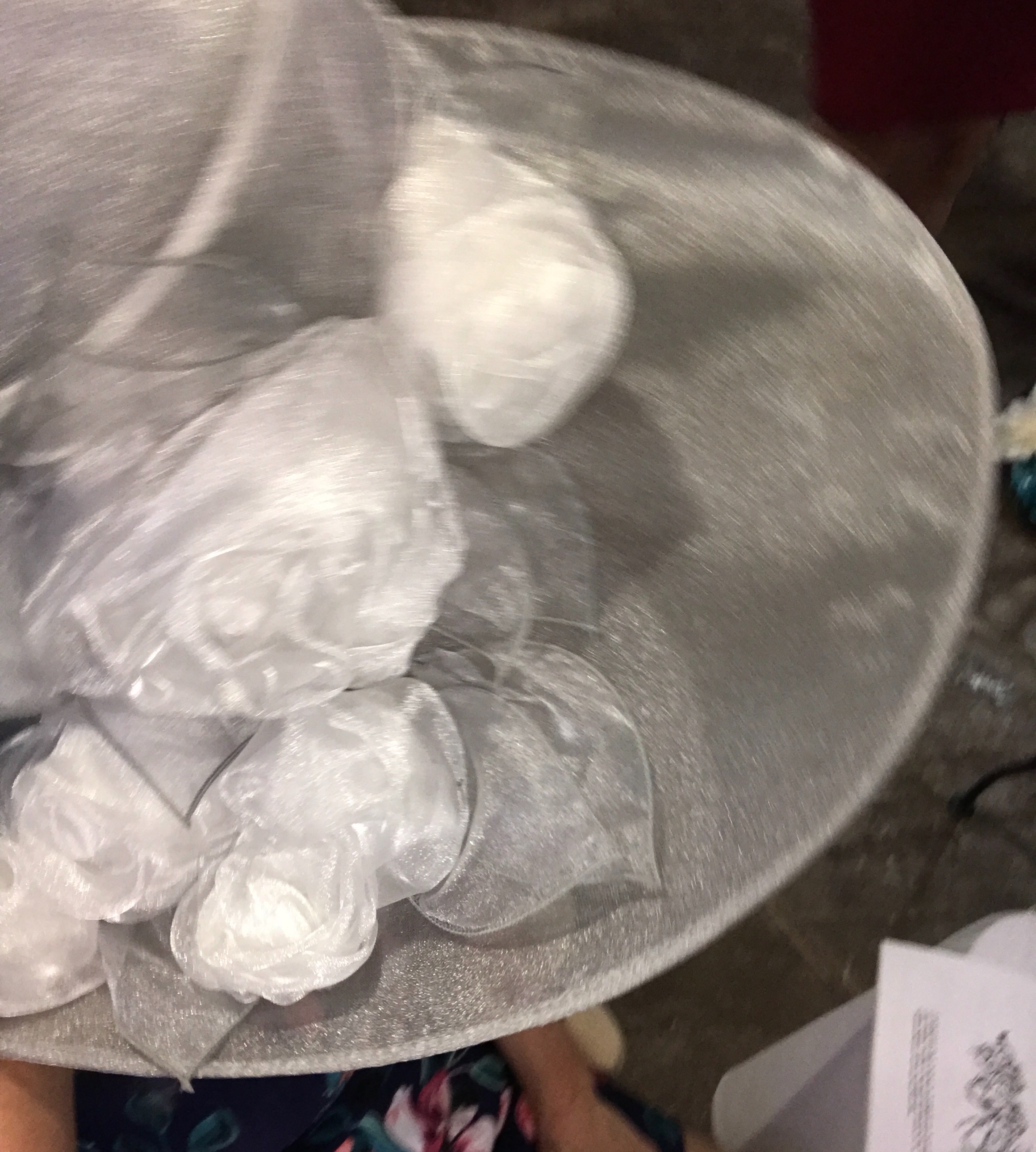 My friend Karen always enjoys this part and commented that it would be fun to bring that era back, to bring back the time that ladies wore hats. Karen is wearing a cabi Spring ’17 top that matches the trim in that beautiful pink chapeau.